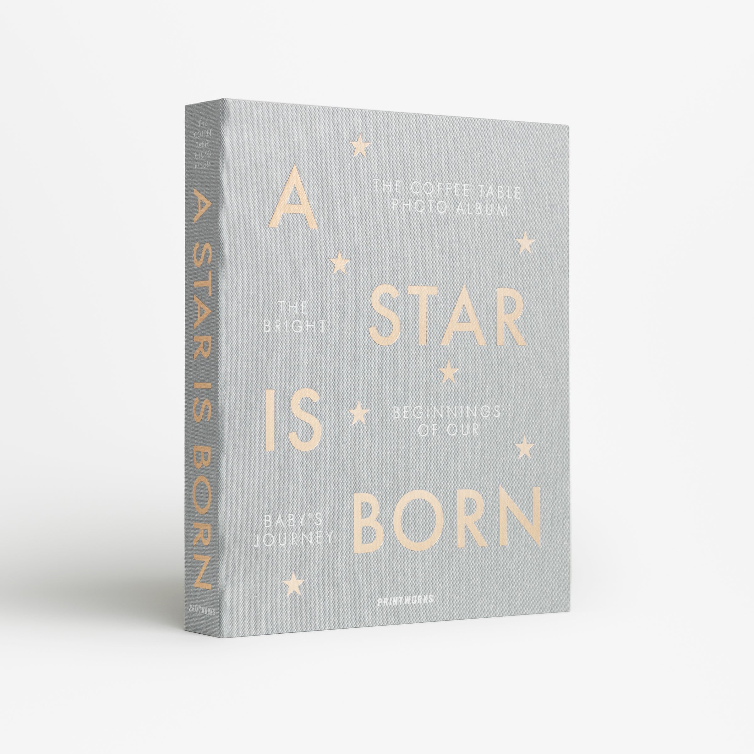 Celebrate your little one’s milestones with the coffee table baby album A Star Is Born, featuring a grey cloth cover with gold foiled text. High-quality white photo paper awaits inside, ready to be decorated. Place it on your coffee table to keep those moments always within reach while elevating your home decor. From Printworks, a brand we love.