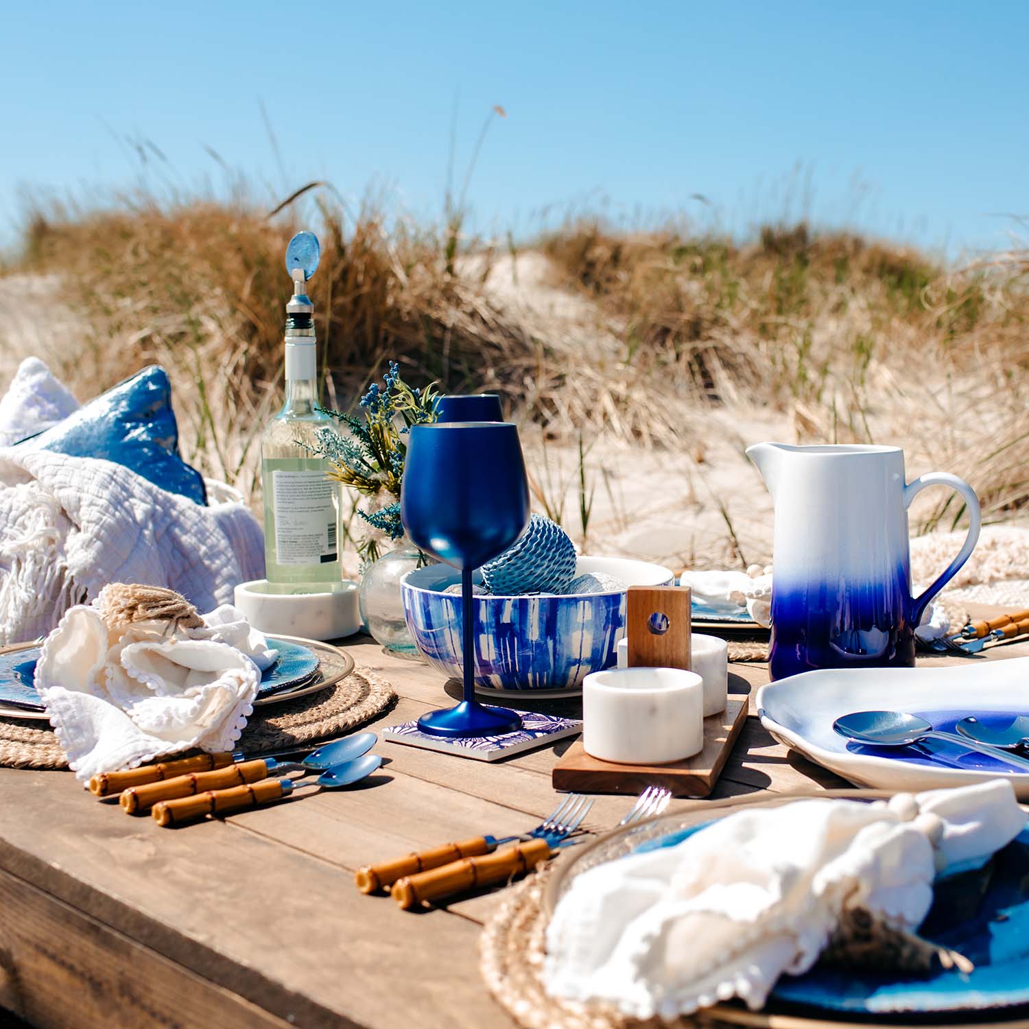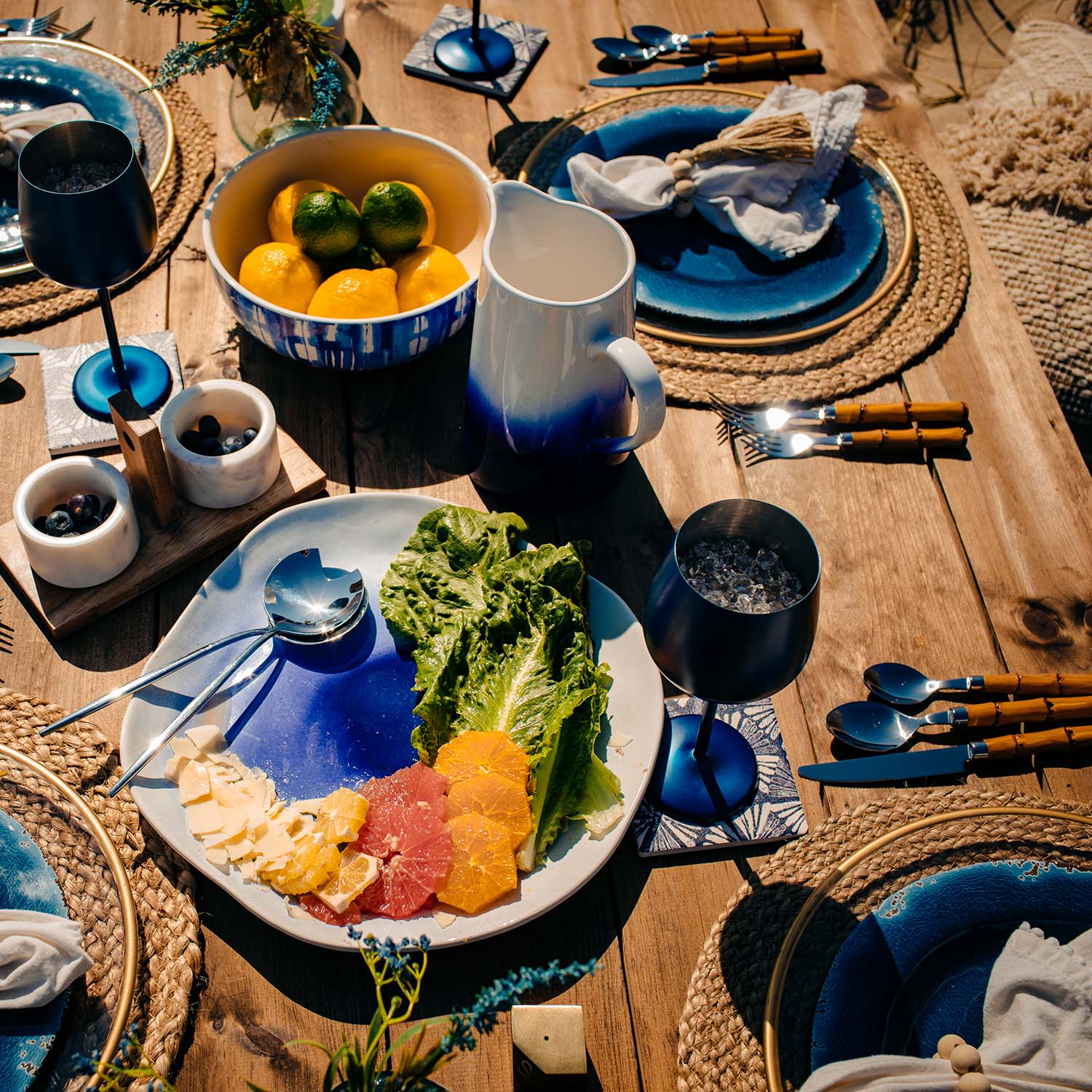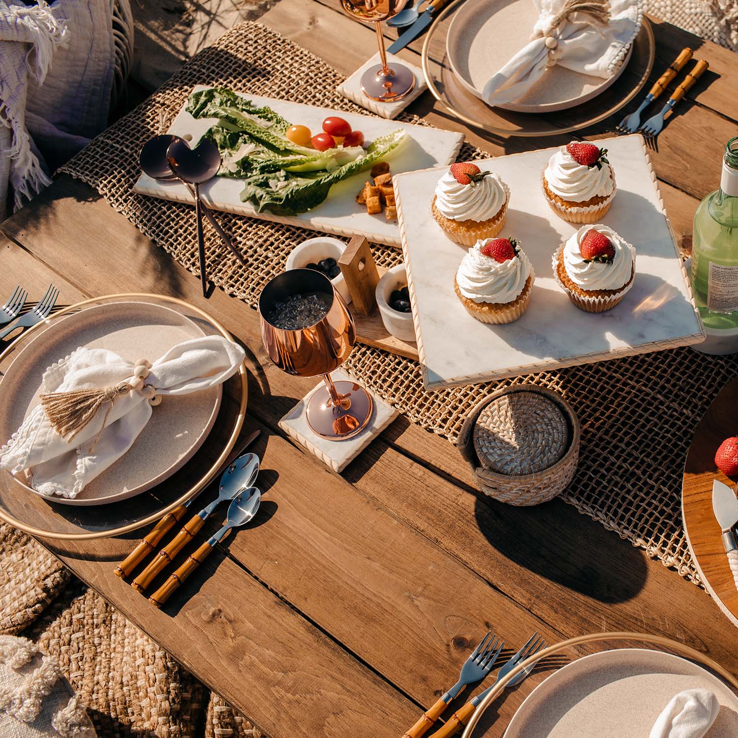 20-piece service for 4 features bamboo-shaped, dishwasher safe plastic handles. Perfect for giving a natural, tropical aesthetic. Pair with rattan chargers and chinoiserie plates for a timeless, colorful tablescape.