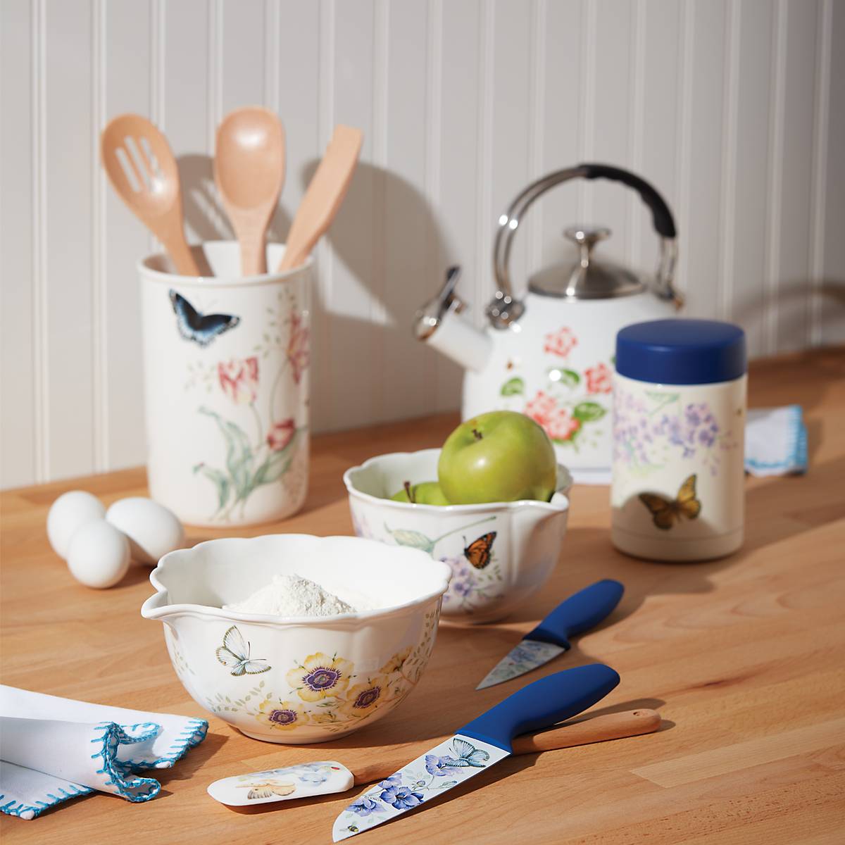 Crafted of durable stainless steel, the Butterfly Meadow Large Insulated Food Container features double-wall insulation that is sure to keeps its contents warm for up to four hours. This item features a motif of butterflies and flowers on its sides, and a handsome blue lid. Hand washing this item is recommended.