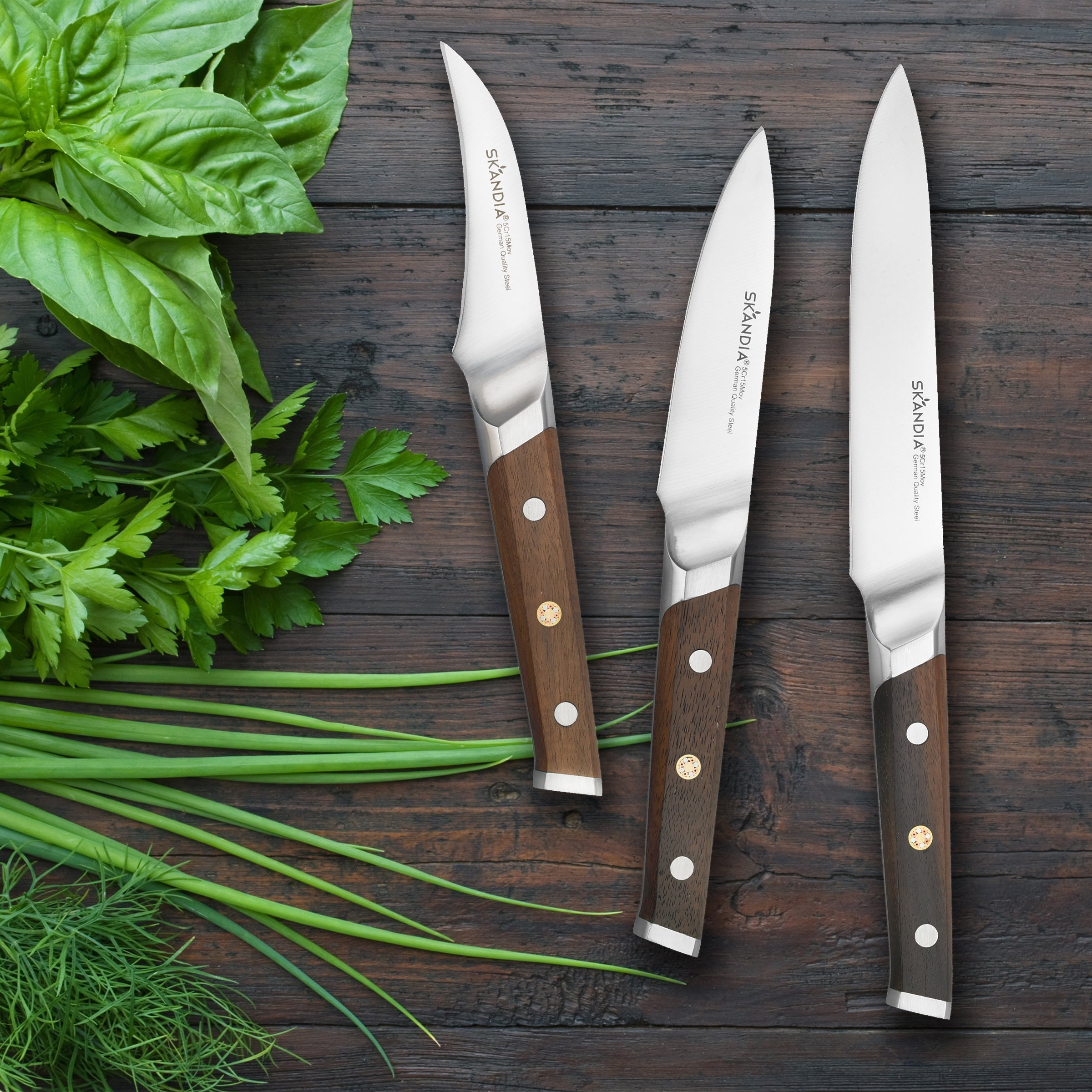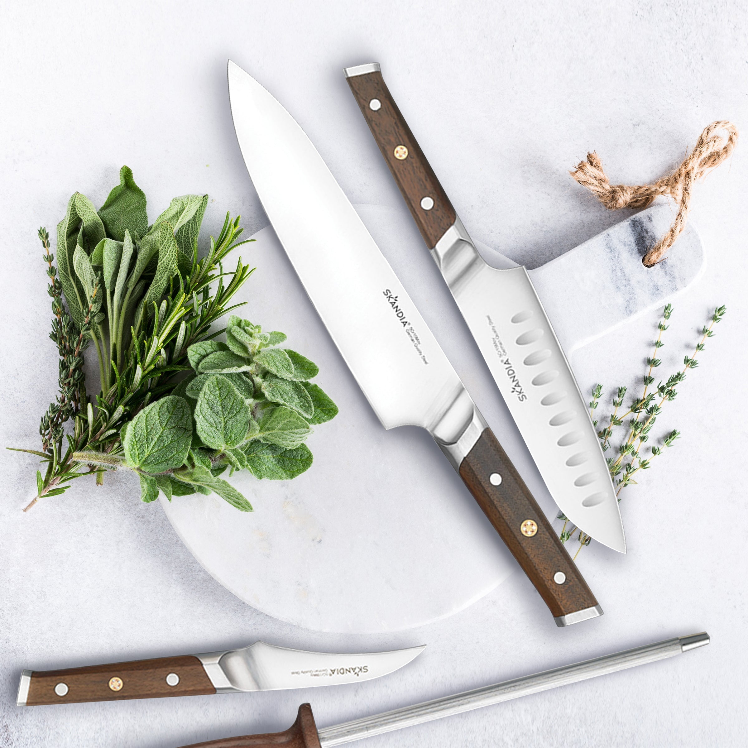 Bring the retro sophistication of natural acacia wood to your prep scene with the Harley 14 Piece Cutlery Block Set by Skandia. Each knife is made from German-quality stainless steel and is fitted with a beautiful triple-riveted, carbonized acacia wood handle, providing signature rustic appeal, beautiful subtle color variation, and superior sharpness. For that added artisanal accent, this set features a prominent accented copper rivet design and comes in an attractive acacia wood knife block for safekeeping, great countertop presence, and that touch of the outdoors.