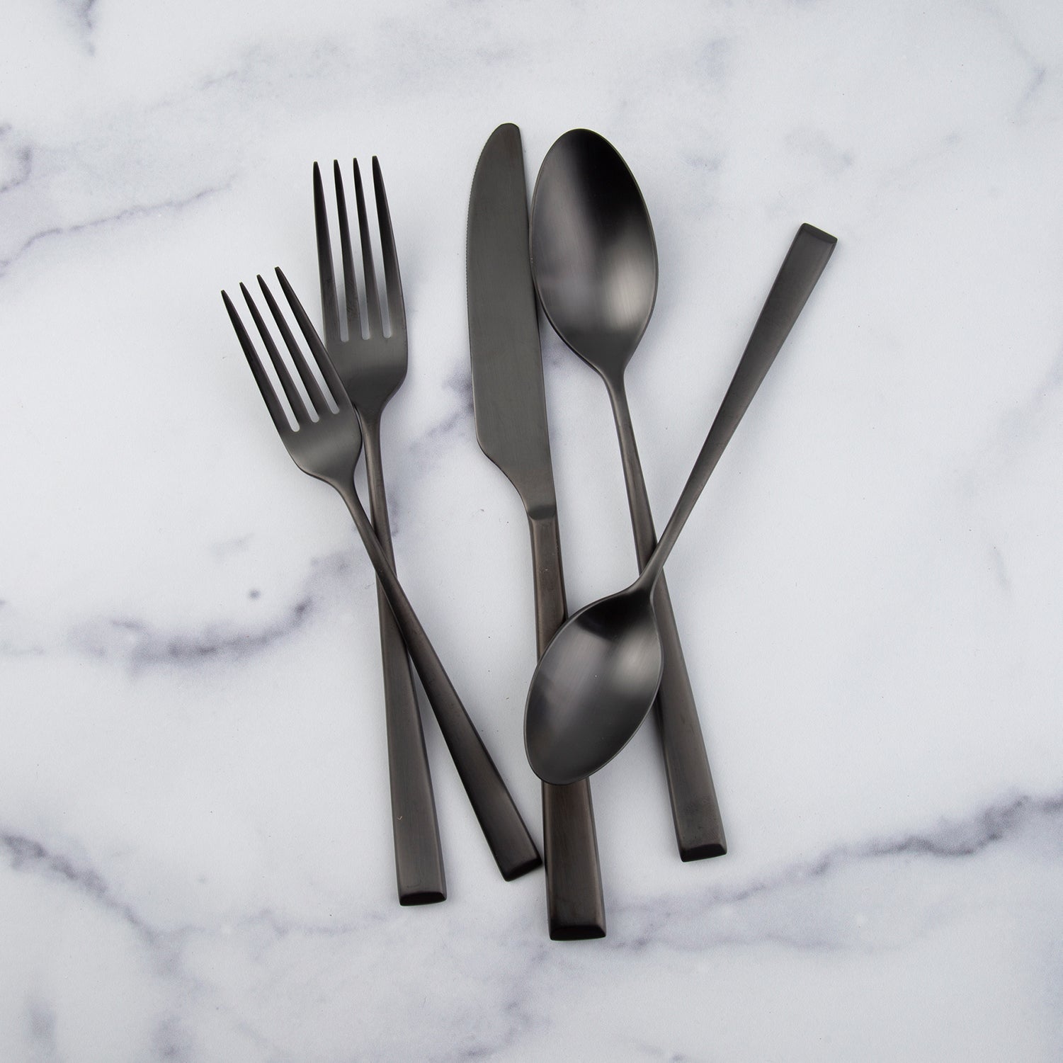 20-piece forged service for 4 with a modern, angled detail on the tip of the handle and a sleek brushed black finish.